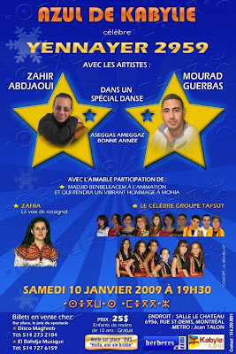 "Azul de Kabylie" débute l'année dans la joie, avec les artistes Mourad Guerbas et Zahir Abdjaoui, qui viendront de Paris spécialement pour l'occasion de Yennayer. Zahia, la voix d'or de la chanson Kabyle est du programme : elle nous transportera certainement en Kabylie avec un Achewiq + chorale et des chants classiques qui demeurent des chefs d'oeuvre de la chanson Kabyle (* À rappeler pour ceux qui ne la connaissent pas : Zahia était membre du groupe "Djurdjura" et a fait partie de la grande chorale de Chérif Kheddam, lors de son Zénith à Paris).